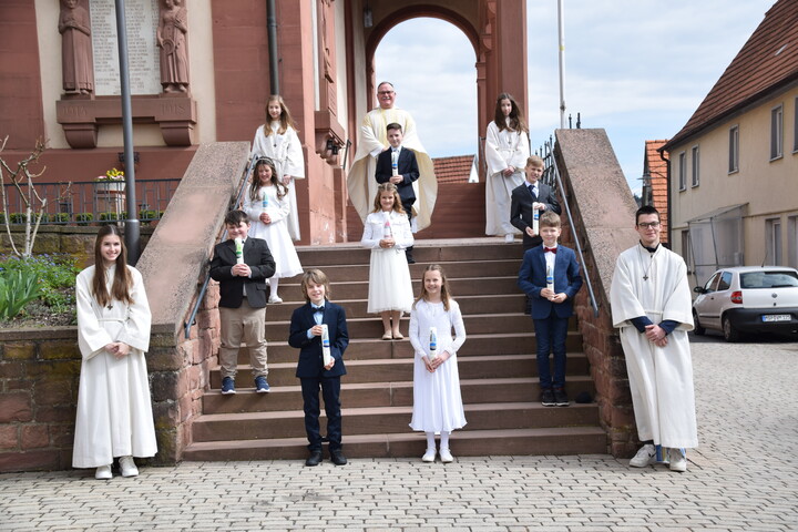 Drei Mädchen und fünf Buben feierten am Weißen Sonntag in der Urspringer Pfarrkirche das Fest der Erstkommunion. Mit gebührendem Abstand zogen sie zusammen mit Pfarrer Stefan Redelberger und den Ministranten in die Kirche ein, die an diesem Tag ausschließlich für die Familien und Angehörigen der Kommunionkinder reserviert war. In seiner Predigt ging Pfarrer Redelberger auf den Evangeliums-Text vom Gang Jesu auf dem See Genezareth ein und schlug den Bogen zum Motto des Vorbereitungskurses „Vertrau mir, ich bin da!“. „Jesus räumt nicht alle Probleme aus, aber er ist da“, sprach er den Erstkommunionkindern Zuversicht zu. Während Simone und Alexander Sommer (Kantoren und Organisten) sowie Janin Schweizer (Querflöte) den Gottesdienst musikalisch perfekt umrahmten, war auch ein Team des Bayerischen Rundfunks vor Ort, um einen Beitrag für Frankenschau aktuell am darauffolgenden Montag zu drehen. Urspringen ist nämlich einer der wenigen Orte, in dem die Erstkommunionfeier nicht verschoben wurde wegen der Corona-Pandemie.