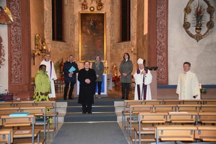 Vier Frauen und zwei Männer wurden am Sonntagabend, 07.03.2021, in der Karbacher Kirche von Weihbischof Ulrich Boom als Gottesdienstbeauftragte eingeführt. Wie Pastoralreferentin Christiane Hetterich eingangs berichtete, startete die Ausbildung, die coronabedingtlänger dauerte, im September 2019. Mit der Feier fand sie nun ihren Abschluss. „Ein herzliches Dankeschön für Ihr Engagement und dafür, dass Sie sich berufen fühlen, den Menschen Orientierungshilfe zu geben“, erklärte der Weihbischof mit Bezug auf die beiden Lesungen unddas Evangelium. Er wünschte den neuen Gottesdienstbeauftragten, dass sie selbst in der Heiligen Schrift immer wieder Stärkung erfahren. Mit der Übergabe der Urkunde bestellte Boom die engagierten Christinnen und Christen, von denen alleine vier aus den Orten der Pfarreiengemeinschaft „Maria – Patronin von Franken“ stammen, offiziell zum Dienst als Wortgottesdienstleiter für die Diözese Würzburg. Zuvor hatten die Gottesdienstbeauftragten am Taufbecken bereits den Lobpreis gesprochen und die anwesenden Gläubigen mit Weihwasser besprengt. Auch Hetterich, die den Vorbereitungskurs gemeinsam mit Pfarrer Stefan Redelberger durchgeführt hatte, sprach ihren Dank aus und überreichte als Geschenk der Pfarreiengemeinschaft das Laacher Messbuch. In diesem sind nicht nur die Lesungen zu finden, sondern auch kurze Gebete, Fürbitten und meditative Texte als Anregung für die künftige Tätigkeit. „Pfarrer Redelberger und ich freuen uns auf die Zusammenarbeit“, verkündete Hetterich freudestrahlend und lud dazu ein, in der jeweiligen Pfarrei ein Praktikum zu absolvieren, um dadurch leichter in den Dienst zu finden. Mit den vier Neuen verfügt die Pfarreiengemeinschaft nun über insgesamt acht Gottesdienstbeauftragte, in jedem der fünf Orte engagiert sich mindestens eine Person. Am Ende der Wortgottesfeier, die von Paul Laudenbacher (Orgel) sowie Jana Schürger und Helena Röhrig (Gesang) musikalisch umrahmt wurde, sorgte Sarah Chege für eine echte Überraschung. Gemeinsam mit ihrer Freundin führte die aus Keniastammende und mittlerweile in Roden beheimatete Chege einen Tanz auf, der typisch für die Liturgie in Kenia ist. Spontan klatschten die Anwesenden rhythmisch mit, während Weihbischof Boom seiner Begeisterung für die Darbietung mit einem Segen für Afrika, Europa und Karbach auf Suaheli Ausdruck verlieh.